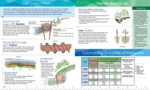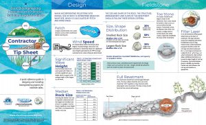 For shoreline contractors, conservationists, and other professionals, the Contractor Tip Sheet provides a wealth of information to assist with designing successful bioengineering projects. The tip sheet walks the user through the process of assessing typical wave heights based on the lake’s fetch, and then providing recommendations for rock sizes used in the stone toe of rock revetment designs. Cross-sectional and plan-view diagrams provide starting points for typical designs that can be modified based on site conditions. There’s even a table to assist with estimating the volumes of materials required for rock revetments in front of coir logs of various sizes.